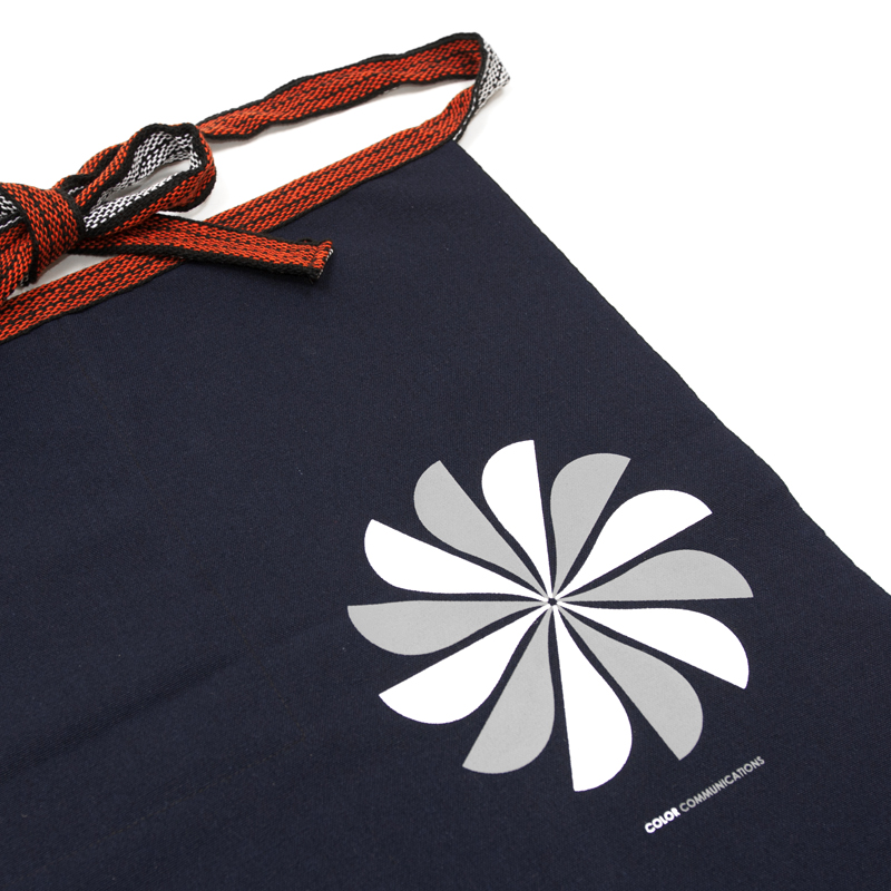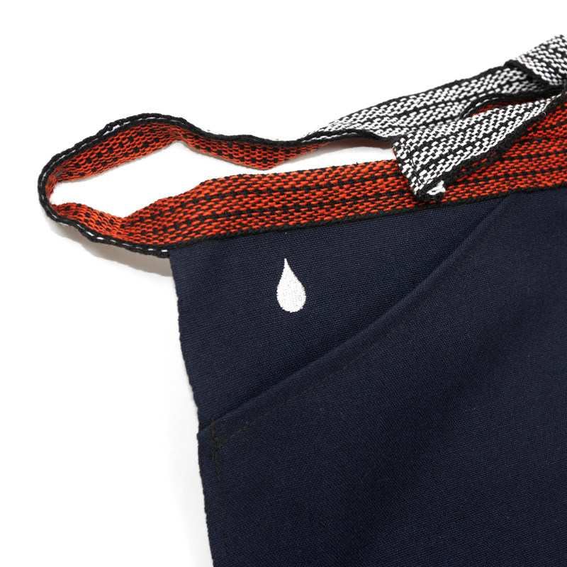右側にポケットがある帆前掛け / 昔からスタンダードな日本の酒屋スタイルのエプロンです。ポケット上部分に DRIP アイコン刺繍、家紋のようなHALF DRIP SWIRLプリント。